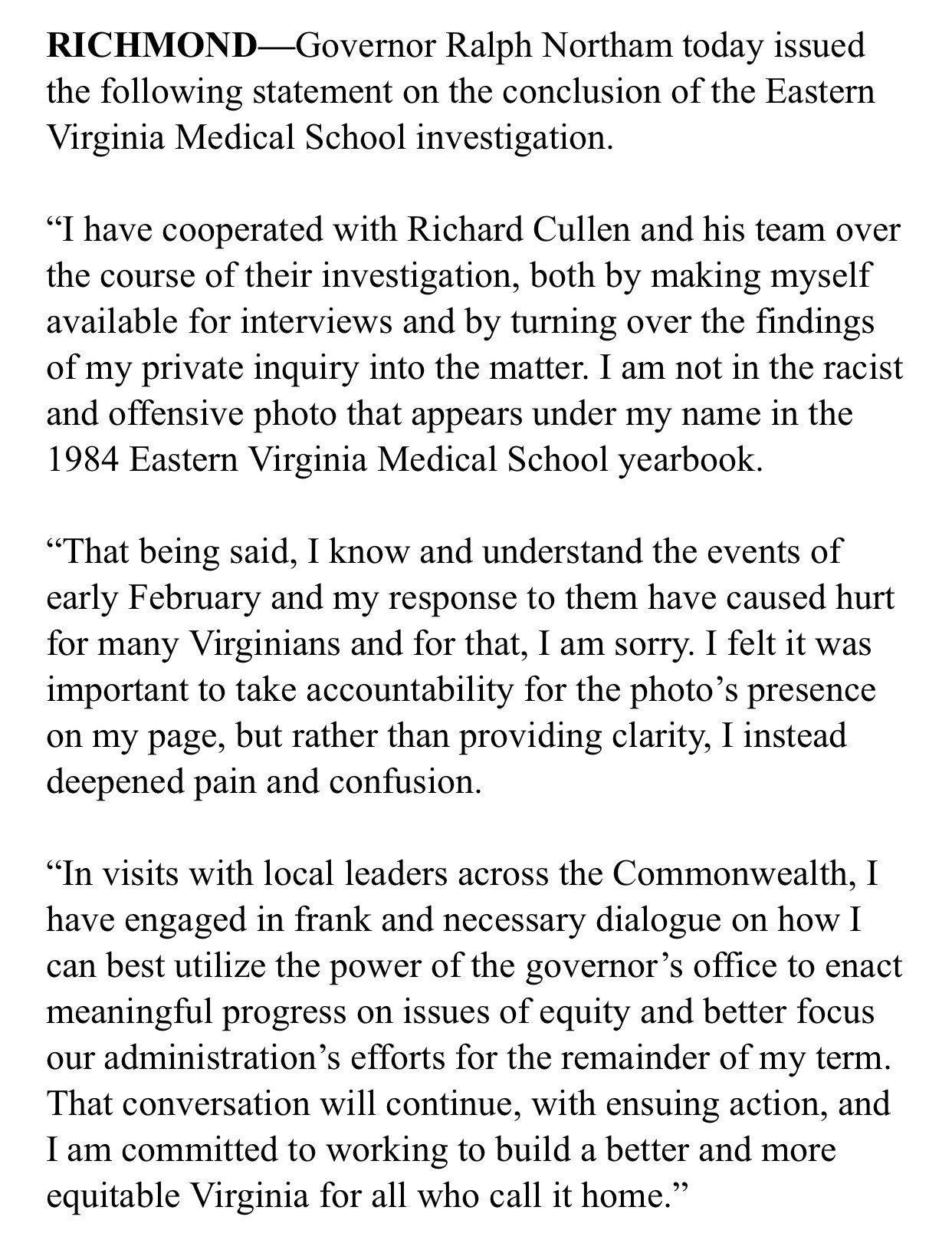 Press conference earlier today to give the results of the yearbook investigation. A reminder - Northam is still governor.