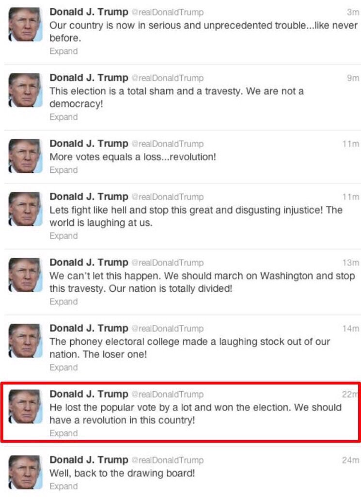 Trump was against the Electoral College and called it a "DISASTER for DEMOCRACY" http://www.usatoday.com/story/news/politics/onpolitics/2016/11/09/trump-called-electoral-college-disaster-2012-tweet/93575326/ |