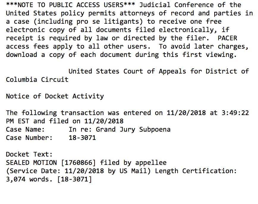 Anonymous wrote:Prosecutors working for Mueller submitted a 3,000-word sealed filing today in federal court in DC. The one judge on that court appointed by Trump has recused himself from this case.