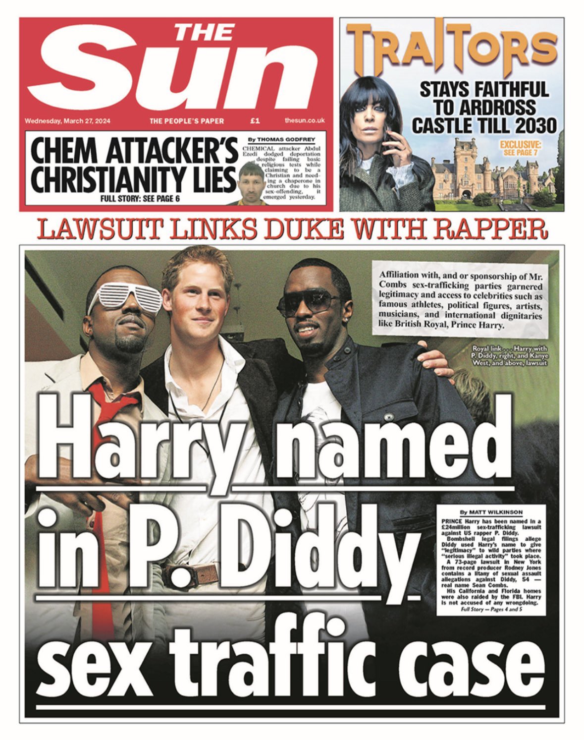 If you want to believe the agenda that the british tabloids are pushing then go right ahead. It’s obvious that they’re obfuscating to make Harry look bad. The lawsuit itself is clear that they’re not saying Harry - or any of the vaguely referenced celebrities - had any part in or knowledge of the wrongdoing. See the tabloid cover below. In big print it says HARRY IS NAMED IN THE SUIT, heavily implying that he conspired with Diddy. Then as a CYA, the small print that nobody is actually going to read says he’s not accused of wrongdoing. Sorry if you fell for it. |