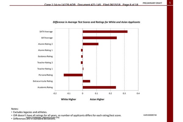 In the court record: Harvard sends out invitations to apply to students in states where they do not get many students. In these states, they sent to white students who scored at least X on SAT, I think it was 1300, but for Asians it was higher, with Asian boys higher than Asian girls. |