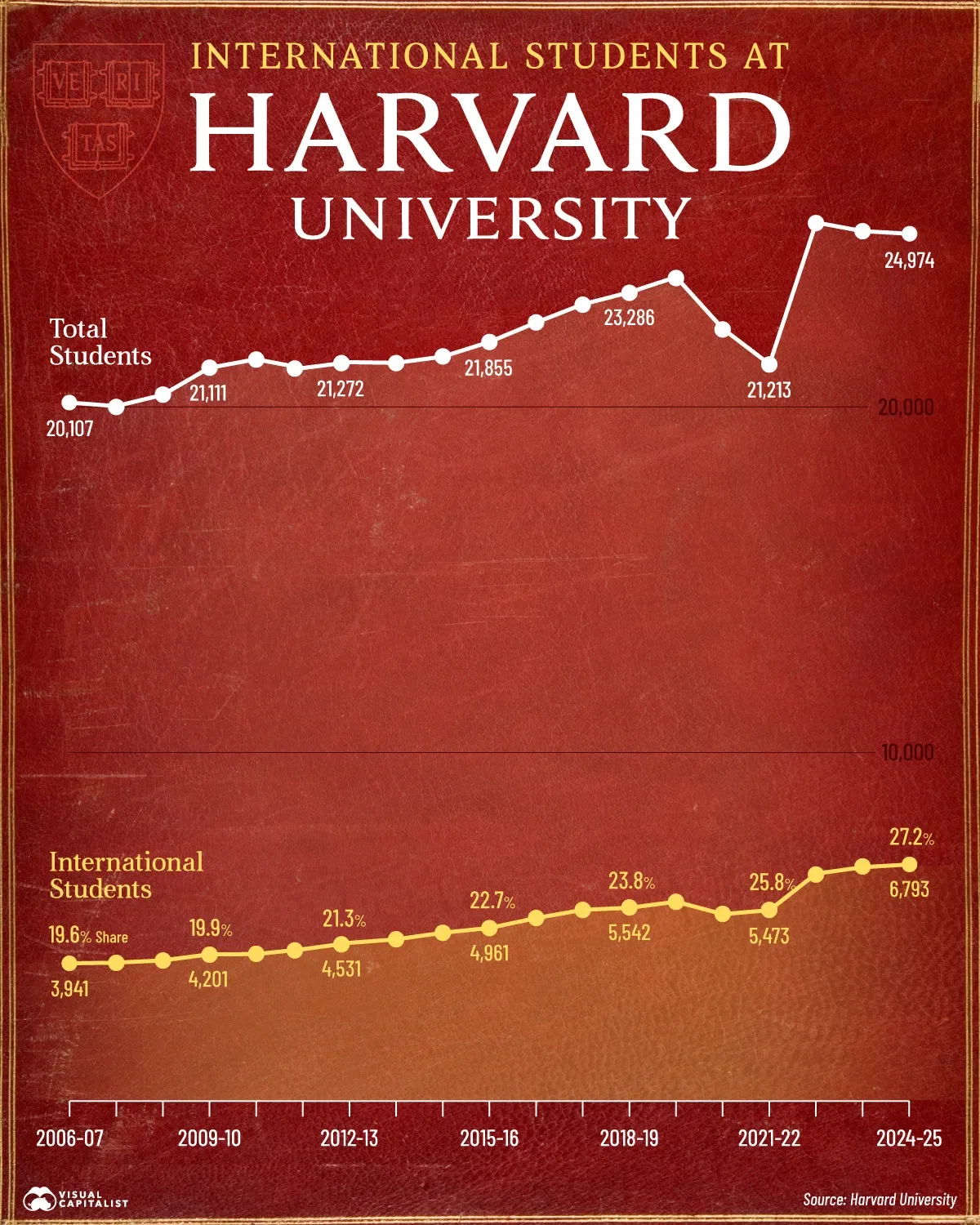 https://oneworld.worldwide.harvard.edu/international-students-at-harvard/ Source for 18% class of 2028-https://college.harvard.edu/admissions/admissions-statistics Class of 1994: https://www.thecrimson.com/article/1990/11/21/the-myth-of-diversity-pbhbarvard-university/ |