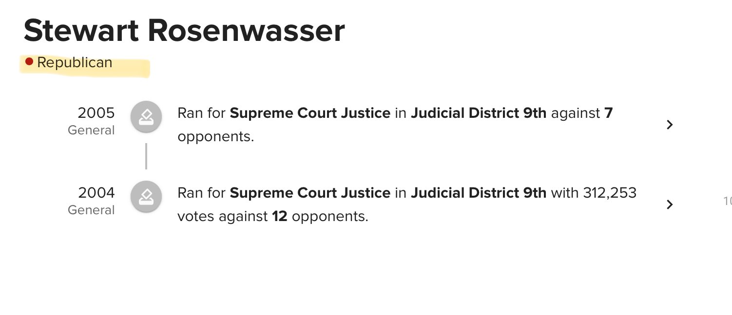 He was an elected Republican judge and the DA who hired him after his retirement is also a Republican. https://www.davidmhoovler.com/da-hoovler-announces-hiring-of-former-judge-stewart-a-rosenwasser-as-special-counsel-for-policy-research-and-legal-development/ |