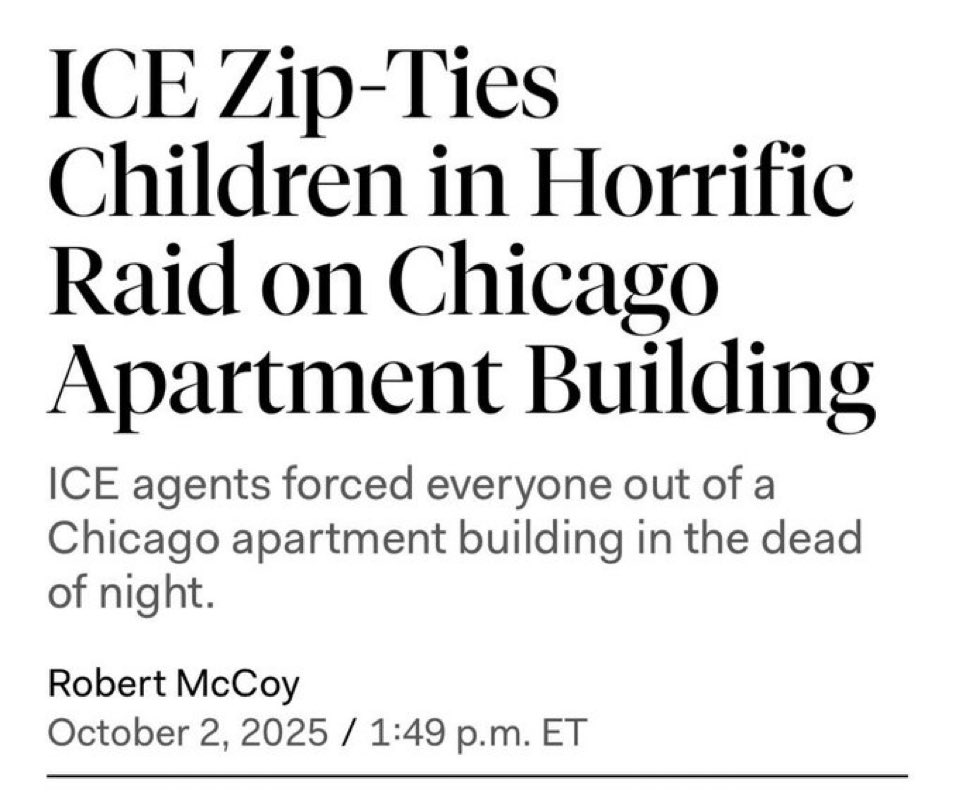 https://www.pbs.org/newshour/nation/immigration-agents-become-increasingly-aggressive-in-chicago Another neighbor, Eboni Watson, said she and others ducked for cover when hearing several flash bangs go off. “They was terrified. The kids was crying. People was screaming. They looked very distraught. I was out there crying when I seen the little girl come around the corner, because they was bringing the kids down, too, had them zip tied to each other,” Watson told WLS, recalling trucks and military-style vans were used to separate adults from their children. https://www.cnn.com/2025/10/03/us/chicago-apartment-ice-raid |