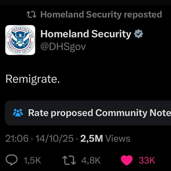 Today Homeland Security posted one word on their Twitter account: "Reimigrate" Still feel welcomed here recent immigrate? Because this means you. https://x.com/DHSgov/status/1978175527329358094 |