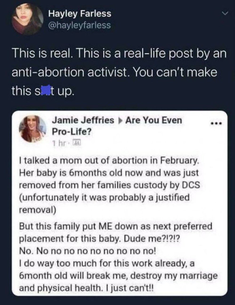 That can’t really be real, right? Does this forced birther not realize that real, live babies will be born to complicated families? And they think they know better than women. So here you go. |