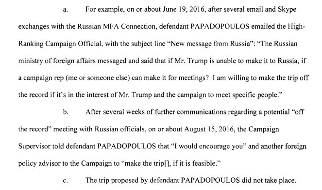 Did you read the Papadopoulos statement? I would strongly advise doing so if you are still saying no collusion. https://assets.documentcloud.org/documents/4163402/Papadopoulos-Statement-Offense.pdf We haven't yet seen any evidence of Trump being aware of his campaign manager and foreign policy advisor's illegal acts, but that's one of the open questions still: what did he know and when did he know it. What we know for certain now is that Papadopoulis was colluding with the Russians, and that Manafort had illegal financial dealings with the Russians. |