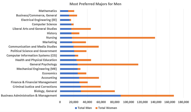 This chart doesn’t prove what you think it does. Aside from the fact that teaching is on the list of women’s majors twice, the only “science” women are taking in great numbers is nursing, which is a classic “pink collar” career (engineering isn’t even on the list). And women are over represented in the “soft” majors, while men are over represented in the business/finance/engineering majors. Business is the only major that’s close to equity, and that’s because business schools are very competitive and they try to admit equal numbers of men and women. |