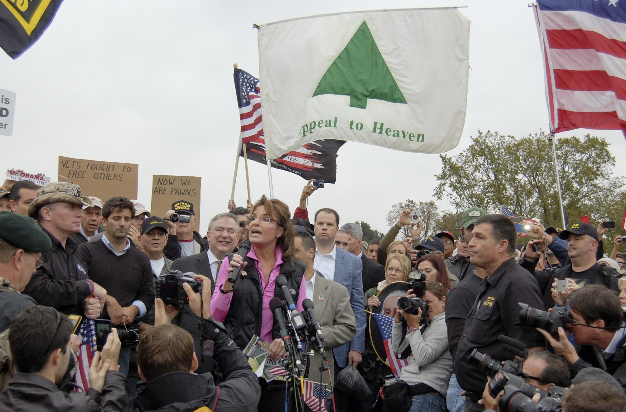 In the 2010s, the flag became appropriated as a religious and political symbol by some conservative, nationalist, and Christian nationalist activists within the United States.[12] In 2013, the flag was seen at a Million Vet March where it flew behind Sarah Palin in photographs. At the time, commentator Andrew Sullivan discussed the relevance of the flag's appearance, focusing on the connections between the historical message of the flag and its modern usage by political conservatives.[13] In 2015, the Freedom From Religion Foundation demanded the flag's removal from a county courthouse in Arkansas.[14] Also in 2015, the Appeal to Heaven flag and slogan were adopted by a conservative religious movement using the same name.[15] In 2019, Illinois State Representative Chris Miller made a public appearance with the flag to "help focus attention" on a National Day of Prayer.[16]