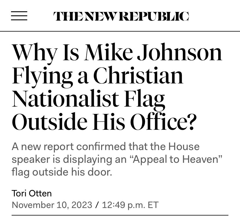 In 2021, some Trump supporters carried the flag during the January 6 United States Capitol attack.[17] In 2023, Supreme Court justice Samuel Alito flew the flag at his New Jersey vacation home.[18]. Also in 2023, Mike Johnson (R LA), newly elected Speaker of the United States House of Representatives, hung the flag outside his Congressional office.