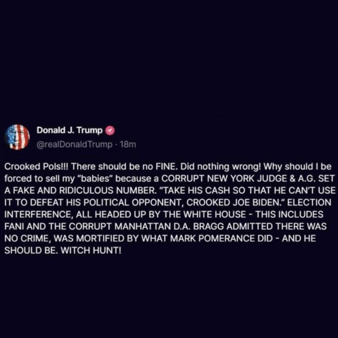 And there’s not going to be any money. It’s going to pay his legal bills and keep him afloat. Trump figured out how to turn campaigning into a personal revenue stream. His MAGA followers are a reliable consumer base for his sneakers, bibles, shares in his publicly traded company, etc. |