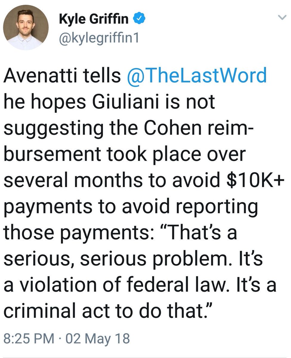 Oh I think the poster on the last page who called this a "nothingburger" was a feeble attempt to defend 45. Just not very articulate. Structuring payments to be under $10k is a money laundering violation. It's business as usual for Trump. |