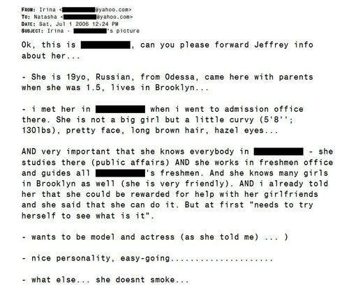 Deprecated is a disgusting phrase for any reason. There were similar awful things in the emails, rejecting much younger marks. This is a much later exchange about another potential recruit between, percolating up through assistants for approval: