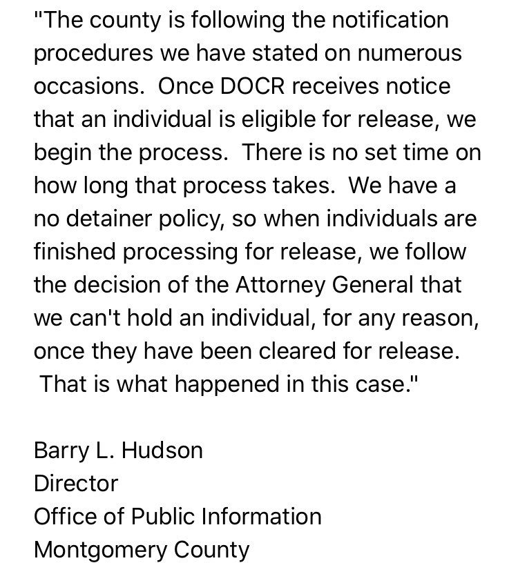 And, this.... Kevin Lewis @ABC7Kevin MORE: ICE says it received only 15 minutes advanced warning of Hernandez-Morales' release. "You need to give us a fair chance to get down there, and I assure you, we’re going to do everything we can to respond to a facility whether it’s in Hagerstown, Rockville or Ocean City." |