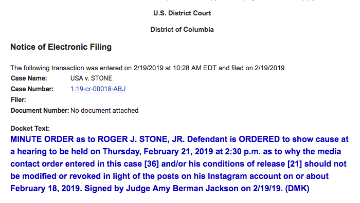 Just like Manafort (and Trump, for that matter) he's never been held accountable for any the ratf**kery he's engaged in his entire professional life. So he doesn't know when to stop. I wouldn't be surprised if Jackson revokes his bail. |