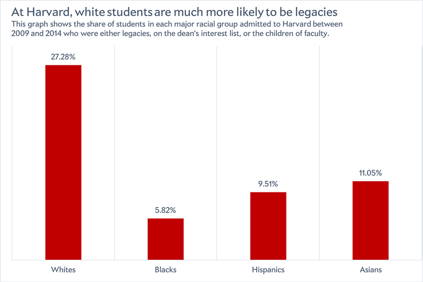of course, to legacies. But, one can only assume that universities refuse to release legacy admit profiles because they know their stats aren't that great. https://www.theguardian.com/us-news/2019/jan/23/elite-schools-ivy-league-legacy-admissions-harvard-wealthier-whiter Students at some of those universities petitioned for the universities to release the data. Unsurprisingly, they didn't. I bet they are hiding the fact that legacy admits largely don't have that impressive stats, especially considering their background. You can claim that private institutions can do whatever it wants, but that doesn't mean that what they are doing is right. Legacies benefit rich white people the most. That's it. It was a practice rooted in racism, and it is still that way today. |