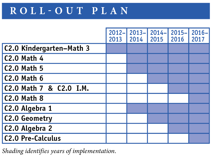 This currently varies across schools based on when 2.0 was rolled out in your school. My older kid took the most advanced math available in elementary school which put her on track for taking Algebra 1 in 8th grade (last year). Three years later, the curriculum had changed an my younger kid also took the most advanced available in her ES (compacted math) but is on track for Algebra 1 in 7th. (Kids in the older kid's year are frustrated to find out that they are a year 'behind' the others going in to their high school.) |