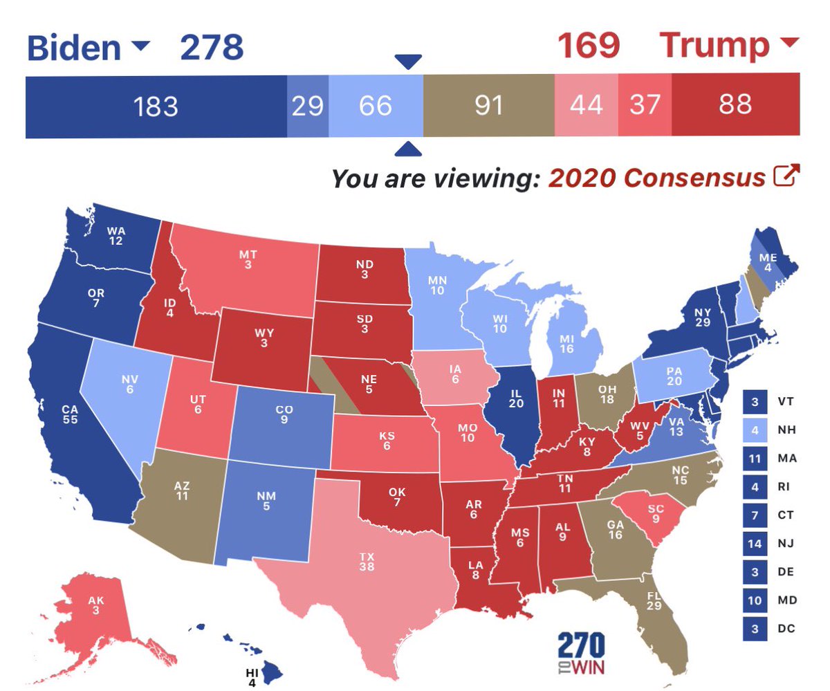 My blue states include: Mississippi, Louisiana, Texas, North Carolina, Georgia (which seems highly unlikely but I think there was a poll that had Biden neck and neck with Trump), Montana, and then more likely ones like Wisconsin, Arizona and Nevada, plus all the purple states like Ohio and Florida. |