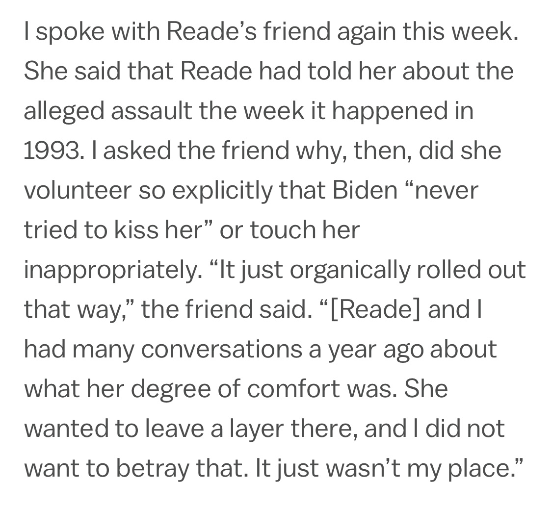 Definitely worth reading. This reporter and others tried to verify the story for a year and weren't able to do so. Now Reade has changed her account and suggested new corroborators that she did not mention to reporters a year ago. In April 2019: Reade told me that she wanted me to think of this story as being about abuse of power, “but not sexual misconduct.” Her emphasis was on how she was treated in Biden’s office by Senate aides, who she said retaliated against her for complaining about how Biden touched her in meetings. “I don’t know if [Biden] knew why I left,” she said. “He barely knew us by name.” |