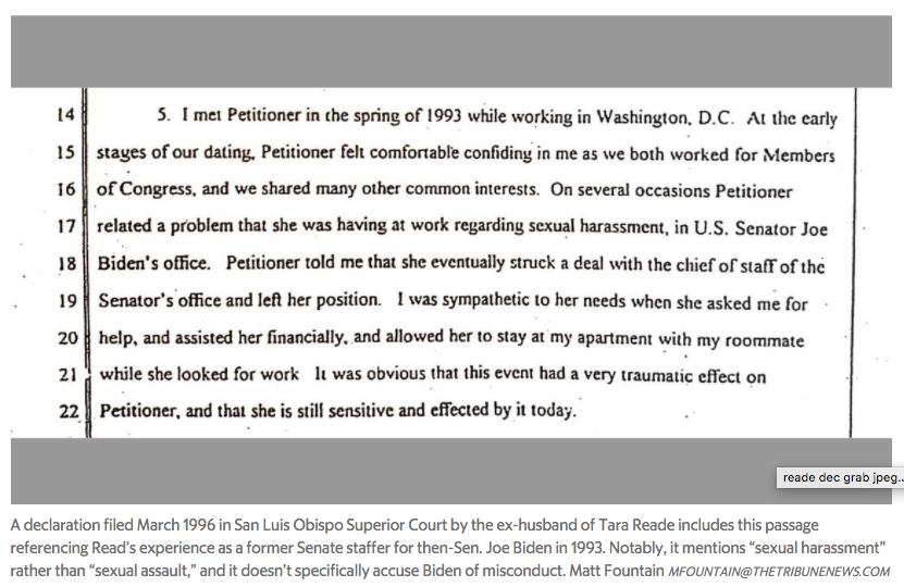 +2. Also, it doesn't say who committed the sexual harassment. And she talks about "striking a deal" with Biden's then-chief of staff, who says he doesn't remember anything about that. |