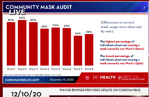 Yeah, I'm curious about the methodology there, but your explanation makes sense, especially wrt teenagers, who are notoriously bad at evaluating risk. And it also makes sense that people who have to wear masks MORE because of their jobs might slack off sometimes. It's easy to wear a mask when I'm outside for a couple hours a day, max. Maybe harder to do so if I have to wear it 8+ hours. Plus, depending on when they did the observation, a lot of Ward 4/7/8 residents might well be working in another ward, and wearing a mask at work. I'd also note that mask compliance appears to be above 50 percent everywhere, which means the majority of people *are* wearing masks. |